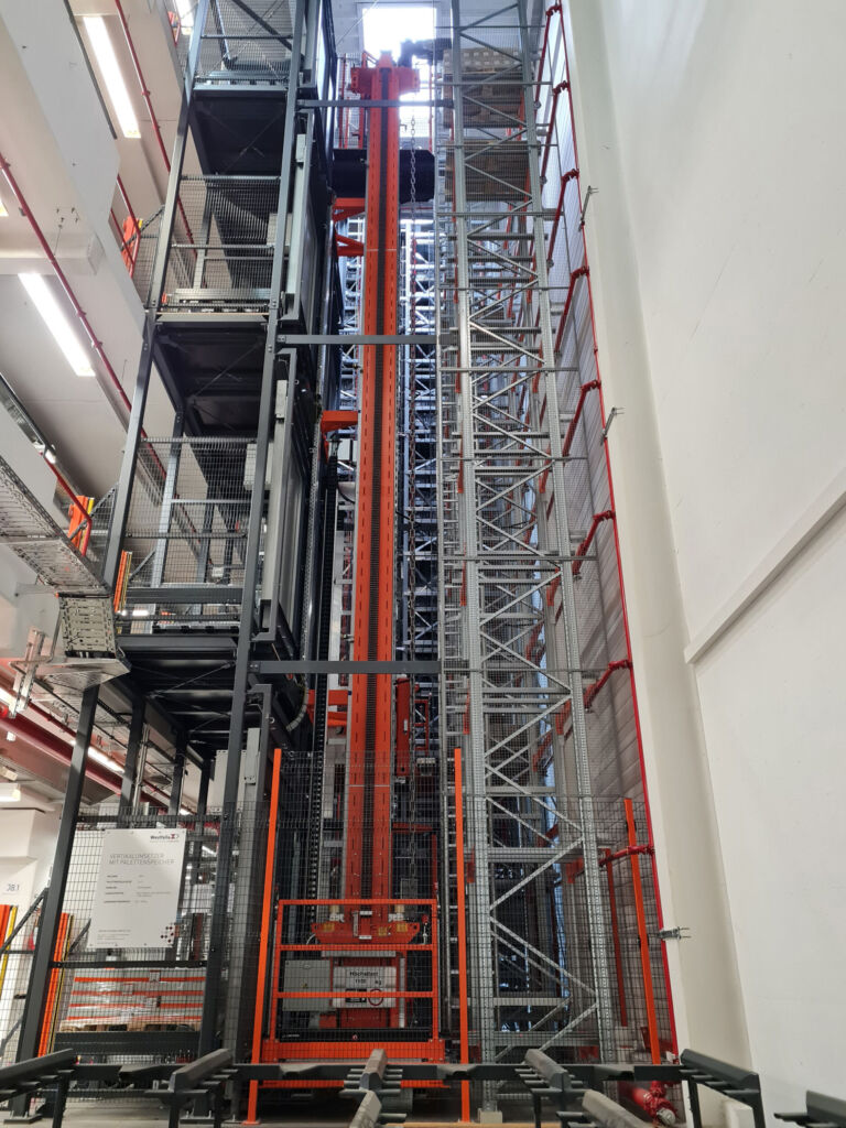 „Unsere Lösung besteht aus zwei ca. 13,7m hohen Senkrechtförderern (SKF) inklusive SPS-Steuerung und rückseitigem Lagerregal mit je neun Einzelplätzen pro SKF auf neun Ebenen, das als Zwischenpuffer dient. Diese SKF nehmen auf vier Ebenen Paletten aus dem AGV-System auf, lagern sie im Regalsystem zwischen, lagern sie von dort wieder aus und übergeben sie an die AGV“, erläutert Westfalia-Projektingenieur Johannes Borchert den zentralen Vertikalstrang. „Für die nötige Geschwindigkeit sind die Senkrechtförderer jeweils mit einer einfachtiefen Teleskopgabel ausgerüstet. Das ermöglicht einen zuverlässigen Betrieb und durch die getrennte SKF-Anordnung eine hohe Redundanz.“ Im Wartungsfall ist immer ein SKF in Betrieb. Die Speicherprogrammierbare Steuerung (SPS), die Westfalia mitlieferte und programmierte, verfügt über die nötige Schnittstelle zur übergeordneten AGV-Steuerung, die auch die Lagerverwaltung des Zwischenpuffers übernimmt.