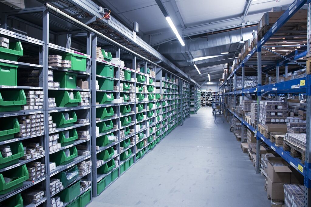 Das Hochregallager bei WSS dient sowohl als Versandlager als auch der Versorgung der Produktion mit Baugruppen und Teilen.